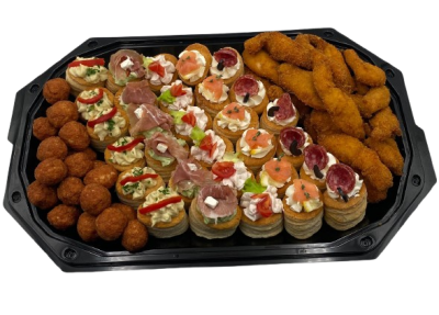 1300gIngrediente: Gujoane de pui - Chiftele de porc - Vol-au-vent cu branza si salam uscat - Vol-au-vent cu somon fume - Vol-au-vent cu icre - Vol-au-vent cu prosciutto crudo - Vol-au-vent cu salata de vinete
